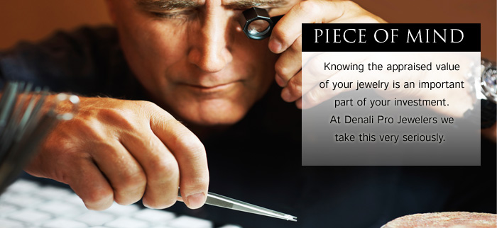 Denali Pro Jeweler’s appraisals are prepared by G.I.A. Graduate Gemologists with over 42 years of retail and wholesale jewelry trade knowledge. Turnaround time is as expeditious as possible, generally five to seven days. Appraisal fees are dependent on the time involved and estimates are given during the initial consultation.